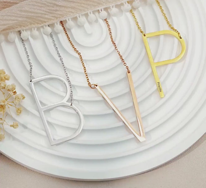 This Large Initial Letter Necklace is perfect for everyday wear. Simply stylish and comfortable. Great for layering. Sideways initial letter necklace is available in silver, gold, and rose gold. Can engrave the text you want in a fixed position of letters.